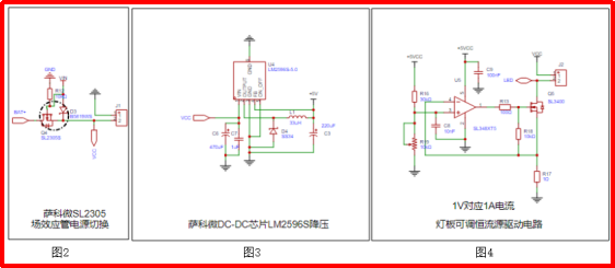 4.3圖2采用薩科微MOS管SL2305S最 大電流4A典型值在柵極4.5V驅動信號時候小于45mΩ,SOT23封裝,此處做開關應用非常適合,內阻非常小,同時該電路實現了電源切換
