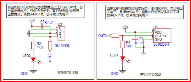 薩科微霍爾SL1609 SL1603X SL1613X都是低功耗霍爾開關,其輸出電流最大5mA,可以直接驅動小信號開關等負載,此處直接接1K電阻和LED燈,當感應到磁場時候LED燈熄滅。