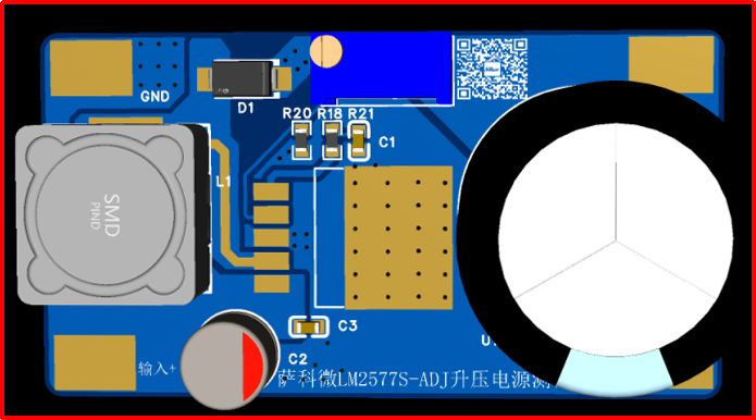 6.給工程師的建議:布局布線建議SW開關節點靠近擺放,走線短而粗,采樣信號遠離SW節點,取末端輸出電壓采樣。同時GND回路面積小,地平面完整。LM2577S-ADJ芯片增加散熱面積,有利于過大電流,祝大家一板成功!