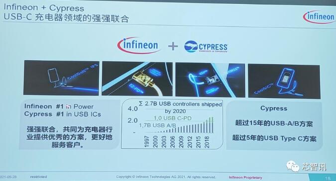 根據英飛凌公布的數據顯示,旗下的賽普拉斯擁有超過15年的USB方案經驗以及5年的USB Type-C方案經驗,是全球[敏感詞]大USB控制芯片供應商。截至2020年,賽普拉斯已累計出貨27億顆USB控制器芯片。其中,在近幾年興起的USB Type-C市場,賽普拉斯也已累計出貨了超過10億顆USB Type-C控制器。