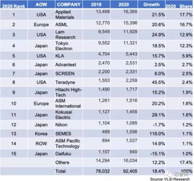 目前在全球半導(dǎo)體設(shè)備市場,主要被美國和日本廠商所占據(jù)。根據(jù)美國半導(dǎo)體產(chǎn)業(yè)調(diào)查公司VLSI Research的2020年全球TOP15半導(dǎo)體設(shè)備廠商銷售額排行榜顯示,前十五大半導(dǎo)體設(shè)備廠分別為:美國應(yīng)用材料、荷蘭ASML、美國泛林集團(tuán)、日本東京電子、美國科磊、日本愛德萬、日本SCREEN、美國泰瑞達(dá)(Teradyne)、日本日立高科(Hitachi Higt-Tech)、歐洲ASM International、日本Kokusai Electric、日本尼康、韓國SEMES、中國香港ASM太平洋科技(ASM Pacific Technology)、日本大福(Daifuku)。這十五家廠商占據(jù)了全球半導(dǎo)體設(shè)備市場82.6%的市場份額。