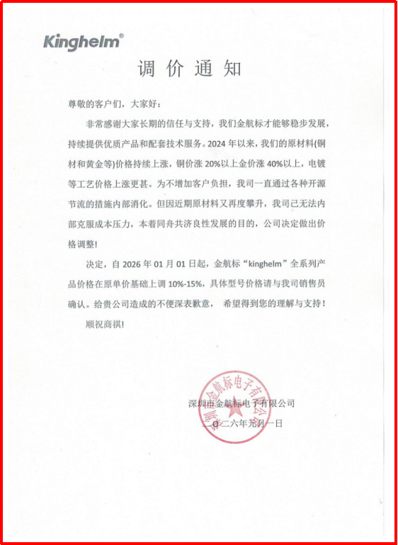 3、受原材料價格持續上漲的影響,金航標(www.kinghelm.com.cn/)2026年1月1日起,全系列產品價格上調10%-15%具體型號價格請咨詢我司業務員,感謝您的支持與信任!