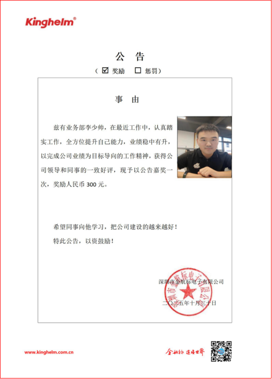 2025年10月27日到2025年10月31日,金航標(www.kinghelm.net)/薩科微(www.slkoric.com)“每周之星”經過同事們評比,金航標/薩科微“每周之星”是金航標業務部李少帥,在最近工作中,認真踏實工作,全方位提升自己能力,業績穩中有升,以完成公司業績為目標導向的工作精神,獲得公司領導和同事的一致好評,現予以公告嘉獎一次,獎勵人民幣 300 元。