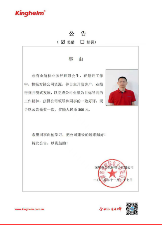 2025年11月24日到2025年11月28日,金航標(www.kinghelm.net)/薩科微(www.slkoric.com)“每周之星”經過同事們評比,這周“每周之星” 是金航標業務經理彭會生,在最近工作中,積極對接公司資源,并自主開發客戶,業績得到井噴式發展,以完成公司業績為目標導向的工作精神,獲得公司領導和同事的一致好評,現予以公告嘉獎一次,獎勵人民幣 300 元。