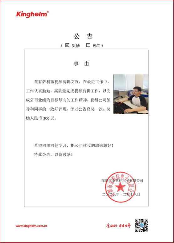 2025年12月15日到2025年12月20日,金航標(www.kinghelm.net)/薩科微(www.slkoric.com)“每周之星”經(jīng)過同事們評比,這周“每周之星” 是薩科微視頻剪輯文宣,在最近工作中,工作認真勤勉,高質量完成視頻剪輯工作,以完成公司業(yè)績?yōu)槟繕藢虻墓ぷ骶瘢@得公司領導和同事的一致好評,現(xiàn)予以公告嘉獎一次,獎勵人民幣 300 元。