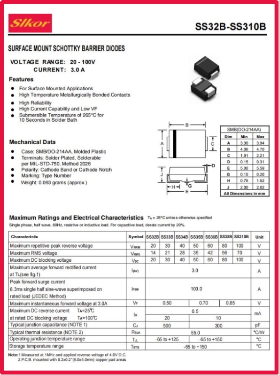 從產品特征來看,薩科微slkorSS36B肖特基二極管具有直流反向耐壓60V、平均整流電流3A等參數,這使得它成為多領域的“全能選手”。