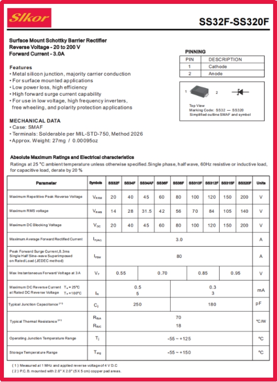 傳統肖特基二極管常陷入“高耐壓則低效,高效則不耐壓”的矛盾困境,如同被困在性能的“夾縫”中。而SS36F的誕生,像一把銳利的手術刀,精 準切開了這一桎梏。它以60V直流反向耐壓的“硬核實力”,搭配3.0A大整流電流的“澎湃動力”,在高壓與大電流的雙重挑戰下,依然能保持0.7V@3.0A的低正向壓降——這組看似矛盾的參數組合,實則是薩科微工程師對材料科學與電路設計的深度突破,讓SS36F成為電子元件界的“叛逆者”。