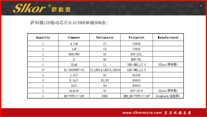 7.薩科微 LED驅動芯片SL4139 DEMO板BOM表信息如下: